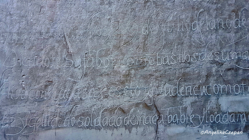 Erstaunlich gut erhalten sind auch noch die zahlreichen Inschriften der spanischen Konquistadoren, Gouverneure und Generäle, die das Gebiet ab 1600 durchquerten. Wer sich genauer für deren Bedeutung und Inhalt interessiert, kann im Visitor Center hierzu einen Trailguide ausleihen. Eine der längsten Inschriften ist die unten abgebildete, in der Juan de Eulate, Generalkapitän der Provinz Neu Mexiko, am 29. Juli 1620 nach seiner Rückkehr vom Zuni Pueblo seinem Herrn und König von Spanien die Unterwürfigkeit der Puebloeinwohner versichert.