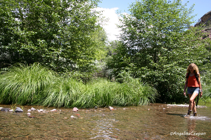 Vom Parkplatz folgt man dem breiten Fußweg hinter der Schranke, der nach wenigen Minuten hinunter ins Tal führt. Recht schnell erreicht man die erste flache Furt. Ein schmaler Fußpfad wechselt nun ständig von einer Fluss-Seite auf die andere. Auch hier wird das Tal zunehmend enger, die Felswände steiler. Der Weg ist besonders im Hochsommer recht angenehm zu gehen, denn zwischen den einzelnen Furten wandert man durch offene Auenwälder mit großen schattenspendenden Bäumen. Eine besondere Attraktion unterwegs sind heiße Quellen, die an einer flachen Stelle im Fluss zwischen der 2. und 3. Furt zu Tage treten und das Wachstum farbiger Algen fördern. Achtung: in den kleinen Pools in Ufernähe ist das Wasser nicht warm, sondern kochend heiß!