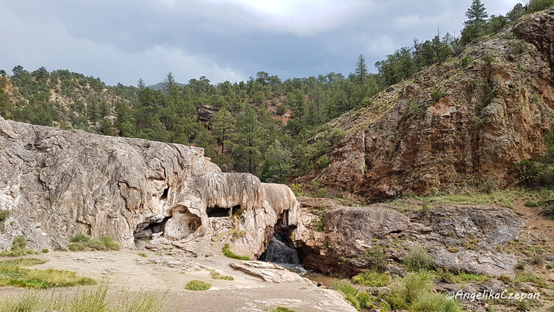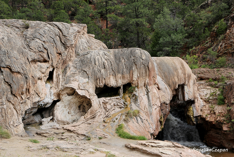 Lage: 19 Meilen nördlich von San Ysidro Eine weitere Attraktion auf der Fahrt durch den Jemez River Canyon sind die ungewöhnlichen Kalksintergebilde rund um den Soda Dam, der als meterhoher Damm nahezu quer zum Tal verläuft und damit eine natürliche Barriere für den Jemez River bildet. Die an dieser Stelle abgelagerte Travertinschichten stammen von mineralienreichem Grundwasser aus dem Gebiet der Valle Caldera, das dort von unterirdischem Magma und heißem Gestein aufgeheizt wird und durch kalkhaltige Gesteinsschichten fließt, bis es schließlich im Bereich des Soda Dam durch wasserundurchlässige Spalten wieder an die Oberfläche steigt, wo sich der mitgeführte Kalk Schicht um Schicht ablagert. Vom Parkplatz kann man ein Stück auf dem Damm entlang gehen oder das Gebiet am Bach rund um den kleinen Wasserfall erkunden.