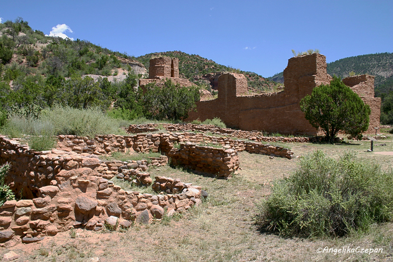 Dominiert wird das Ruinengelände allerdings von den gewaltigen Mauern und dem oktogonalen Glockenturm der spanischen Missionskirche San José de los Jemez, die 1621/22 von Franziskanern erbaut wurde, um die Einwohner des Pueblos zum Christentum zu bekehren. Dieser Versuch stieß allerdings auf erbitterten Widerstand. Die Kirche wurde niedergebrannt, die Siedlung verlassen. Später kehrten die Einwohner zwar für kurze Zeit wieder zurück. Nach der Pueblorevolte im Jahr 1680 wurde Giusewa aber schließlich endgültig aufgegeben und weiter südlich eine neue Siedlung erbaut, das heutige Walatowa oder Jemez Pueblo. Öffnungszeit des Jemez State Monument: Mi-So 8.30 - 17 Uhr (Mo, Di geschlossen).