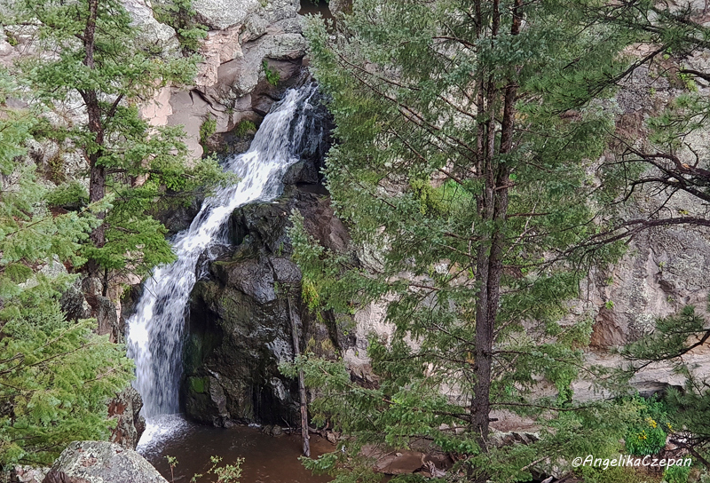 Hinter La Cueva macht der Hwy 4 einen großen Bogen und führt dann im weiteren Verlauf nach Südosten Richtung Bandelier National Monument. Unterwegs lohnt vor allem im Frühjahr der kurze Abstecher zu den Jemez Falls, einem 22 Meter hohen Wasserfall, den man über einen kurzen Fußweg vom Jemez Falls Campground erreicht. Dieser Campground befindet sich am Ende einer Stichstraße, die 5,5 Meilen südöstlich von La Cueva vom Hwy 4 abzweigt. Auf ihr erreicht man nach 0,8 Meilen zunächst den Campground, 0,5 Meilen weiter dann die Picnic und Day Use Area. Hier beginnt am hinteren Ende des Parkplatzes der Weg zu den Jemez Falls. Durch eine Wald mit hohen Kiefern wandert man 0,25 Meilen bergab bis zu einer Aussichtsplattform auf die gegenüber liegenden Fälle.