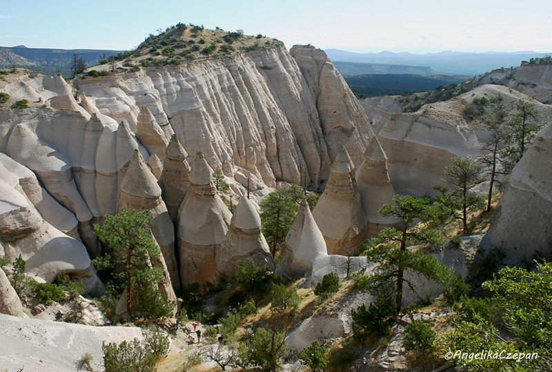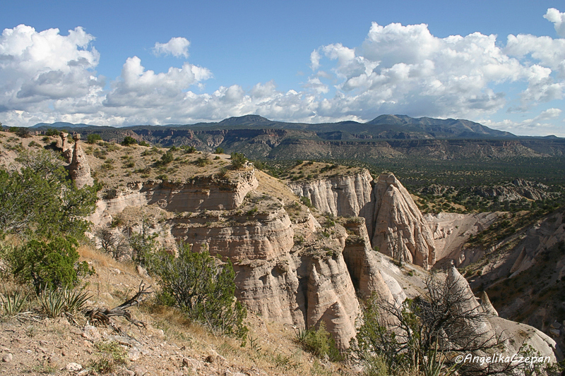 Am Ende des Slot Canyons weitet sich die Schlucht zu einem großen Amphitheater mit vielen großen und wunderschön geformten Felskegeln. Aus diesem Kessel führt ein kurzer, aber steiler Pfad in vielen Serpentinen hinauf auf das knapp 200 Meter höher gelegene Canyonplateau. Unterwegs entschädigen die vielen schöne Blicke auf dieses markante Amphitheater für die Mühen des Aufstiegs. Oben angelangt, bietet sich ein beeindruckender Fernblick auf die Gebirgsketten der Sandia, Jemez und Sangre de Christo Mountains. Der Weg führt nun fast eben auf dem Canyonplateau entlang zu weiteren schönen Aussichtspunkten und endet schließlich an einem schmalen Felsvorsprung mit tollem Blick auf die bizarre Felslandschaft der Tent Rocks und das von hohen Bergketten eingerahmte Tal des Río Grande.