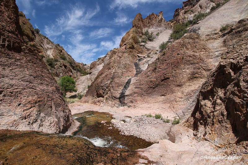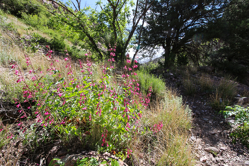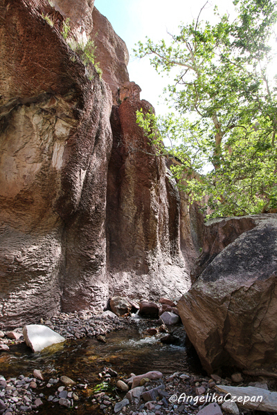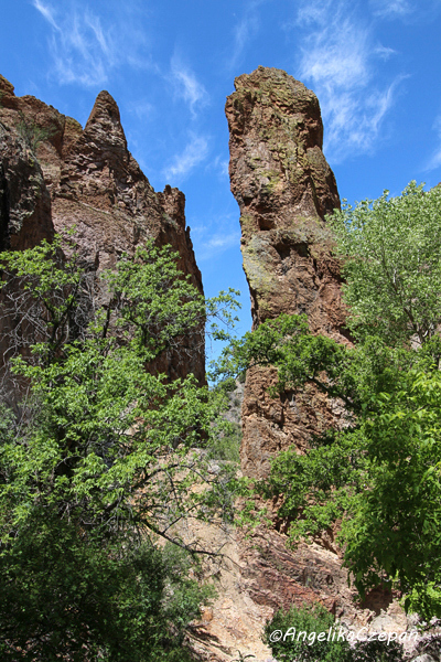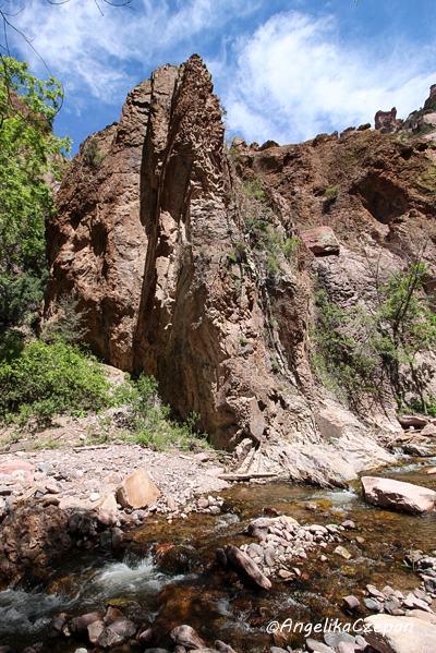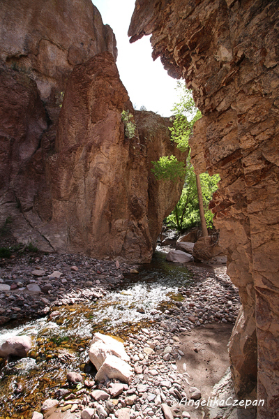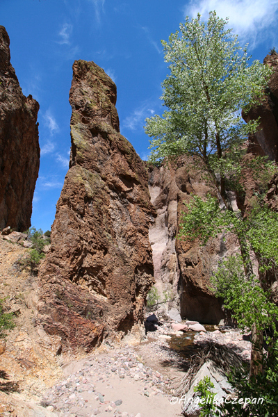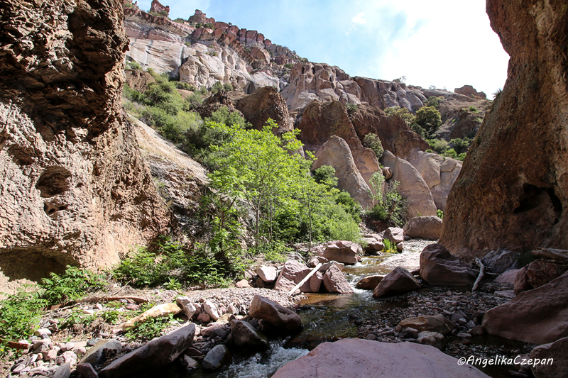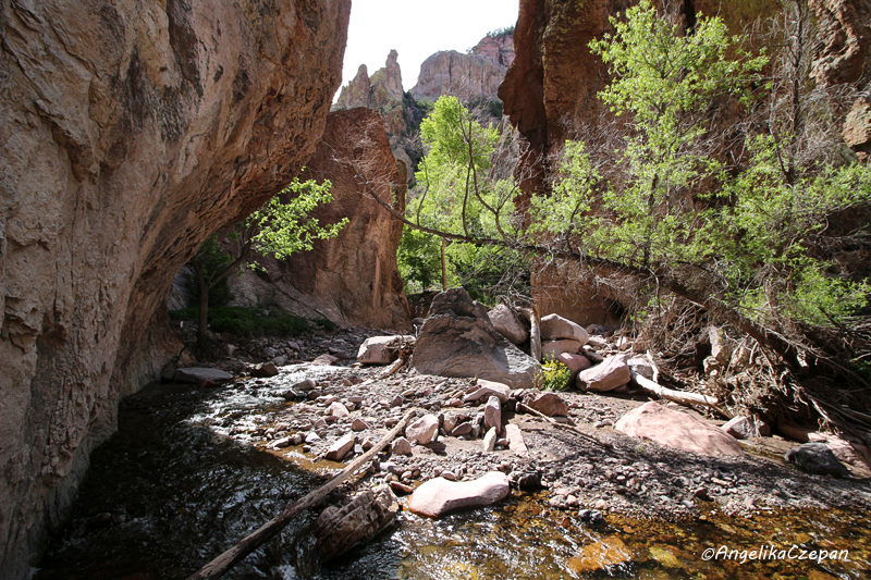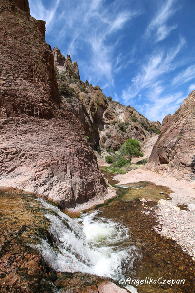 Der Weg ist von Anfang an ein landschaftlicher Genuss. Ein munter vor sich hin plätschernder Gebirgsbach, eingezwängt zwischen steile, hoch aufragende Felswände, dazwischen immer wieder hübsche Cottonwood Trees, durch deren leuchtend grünes Blätterdach die Sonnenstrahlen hervorblitzen, eine frische und klare Luft, Vogelgezwitscher, kleine Eidechsen, die über die Felsen flitzen. Besonders eindrucksvoll sind auch die großen schlanken Felspfeiler, die an mehreren Stellen im Canyon steil in den Himmel emporragen. Sie bestehen ebenso wie die Felswände im unteren Teil des Canyons aus vulkanischem Tuffgestein. Weiter canyonaufwärts findet man dagegen jüngeres Vulkangestein wie Rhyolith und Andesit.