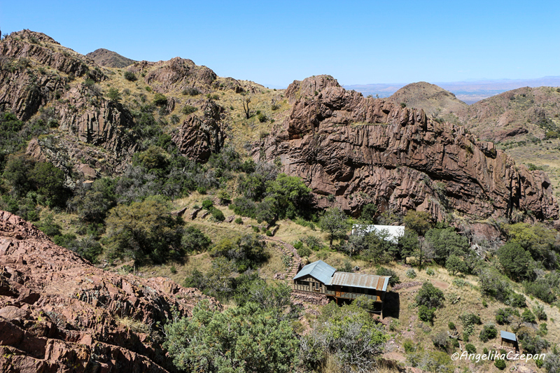 Von der breiten Felsplattform neben dem Wasserfall bietet sich auch ein schöner Blick nach unten auf das ehemalige Sanatoriumsgebäude, die mächtigen Felswände am Eingang des Tals und die weite Ebene des Rio Grande Valley in der Ferne.