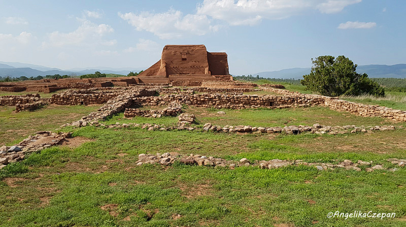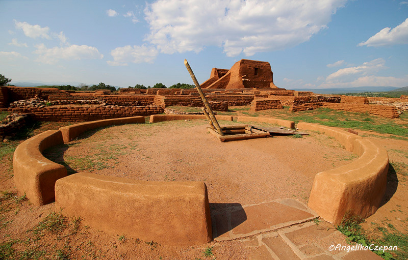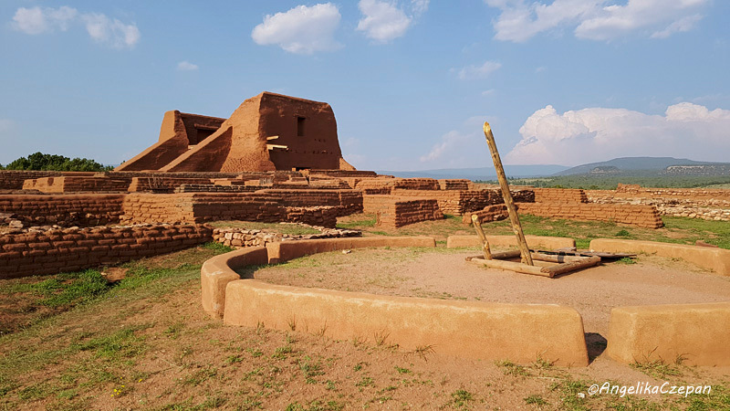 Direkt hinter dem Visitor Center beginnt der Ancestral Sites Trail, ein einfach zu gehender Rundweg von 1,25 Meilen. Er führt an der mächtigen Umfassungsmauer vorbei zu den Grundmauern des einstigen Pecos Pueblo oben auf dem Hügel. Von hier hat man einen schönen Blick nach Osten über die weite Ebene der Plains, wo die Handelsgeschäfte abgewickelt wurden und die Plainsindianer ihre Zeltlager aufschlugen. Dahinter liegt eine große restaurierte Kiva, die den Puebloindianern als Zeremonialraum diente. Über eine Leiter kann man hinabsteigen.