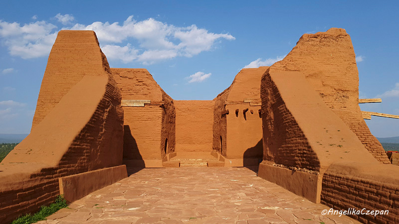 Von diesem Umkehrpunkt geht es auf der Kammlinie zurück bis zur einstigen Klosteranlage und den mächtigen Ruinen der Missionskirche aus dem Jahr 1717. Auf dem großen Platz davor befindet sich eine zweite restaurierte Kiva, in die man ebenfalls hinabsteigen kann. Von hier geht man dann an der Picnic Area vorbei zurück zum Visitor Center. Wer nicht den ganzen Weg gehen möchte, kann auch direkt an der Picnic Area parken. Von dort ist man in wenigen Schritten bei der restaurierten Kiva und den mächtigen Ruinen der Missionskirche.