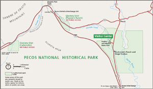Von Santa Fe kommend nimmt man von der I-25 den Exit 299 und fährt dann 6 Meilen auf dem Hwy 50 bis Pecos Village und von dort noch 2 Meilen nach Süden auf der NM 67 bis zum Parkeingang. Kommt man auf der I-25 aus der anderen Richtung, nimmt man von der I-25 den Exit 307 und fährt dann auf der NM 63 4 Meilen nach Norden bis zum Park.