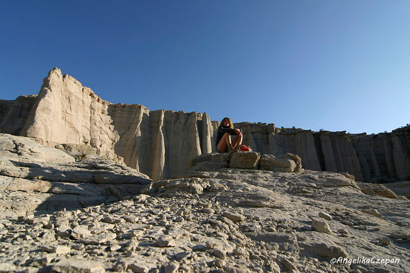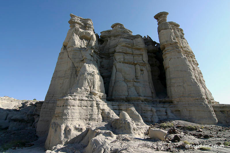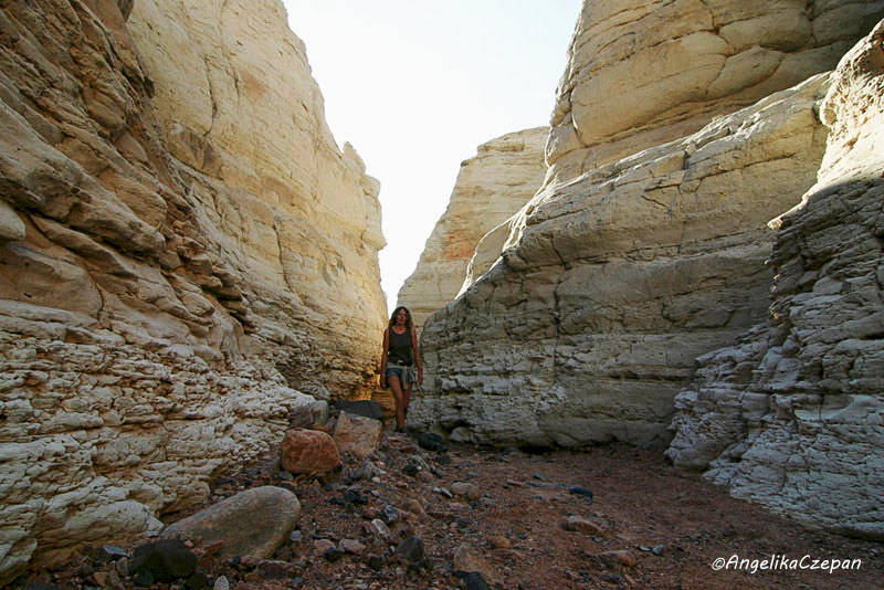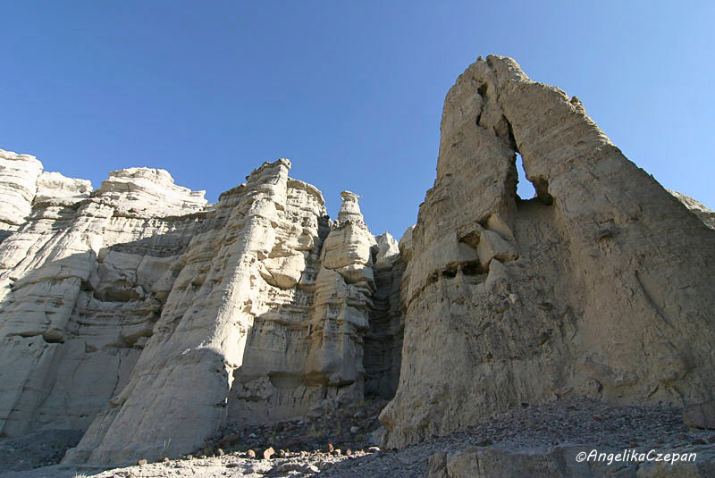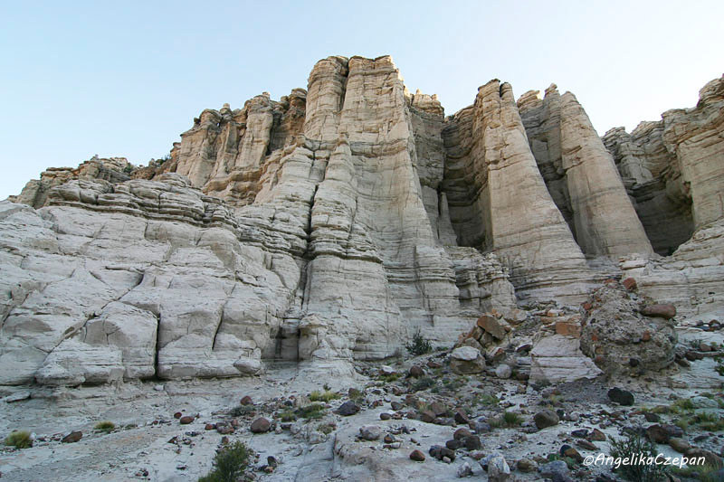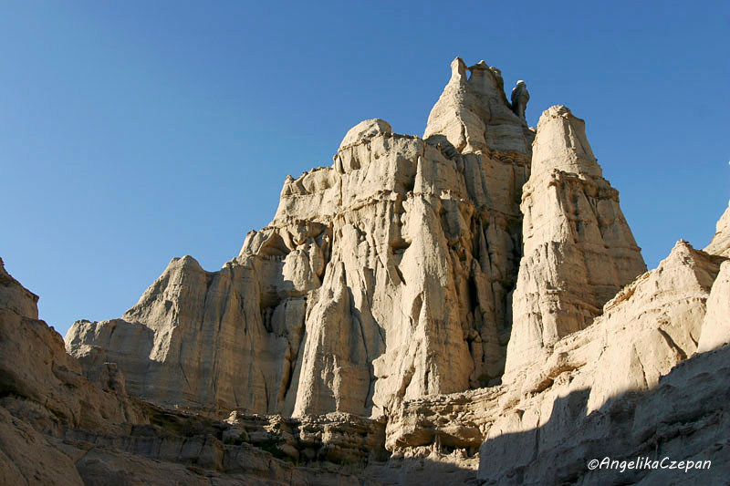 Vom Parkplatz bietet sich bereits ein schöner Blick hinunter in das Tal, dessen Eingang von einer Gruppe schlanker ‚Alabaster'-Hoodoos mit dunkelgrauen Hüten bewacht wird. Dort angekommen, wendet man sich nach links und folgt dann einem breiten, steinigen Wash, der in großen Windungen nach Nordwesten verläuft. Je weiter man diesem ausgetrockneten Bachbett folgt, desto höher und gewaltiger werden die mächtigen weißen Felstürme, bis sie schließlich eine Höhe von 150 Metern erreichen und dabei so dicht zusammenrücken, dass sie eine geschlossene Säulenwand bilden. Blickt man um sich, hat man das Gefühl, in einem weißen Märchenschloss unterwegs zu sein oder in einem aus weißem Marmor erbauten Felsentempel.