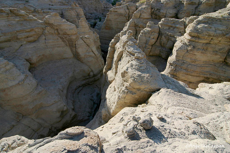 Oben angelangt, bietet sich ein weiteres spektakuläres Panorama, denn nun steht man inmitten eines riesigen Amphitheaters, das von strahlend weißen Felswänden eingerahmt ist (PLA06). Von hier oben bietet sich auch ein letzter grandioser Blick nach Osten auf die gewaltigen Felsbastionen und Säulengänge dieser ungewöhnlichen weißen Felsenstadt und hinunter in das tief eingeschnittene Schluchtenlabyrinth des Slot Canyon, aus dem man gerade empor geklettert ist.
