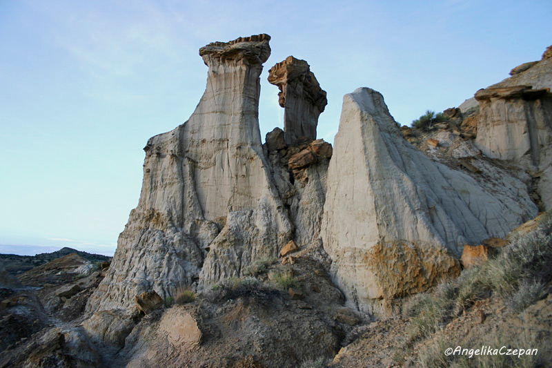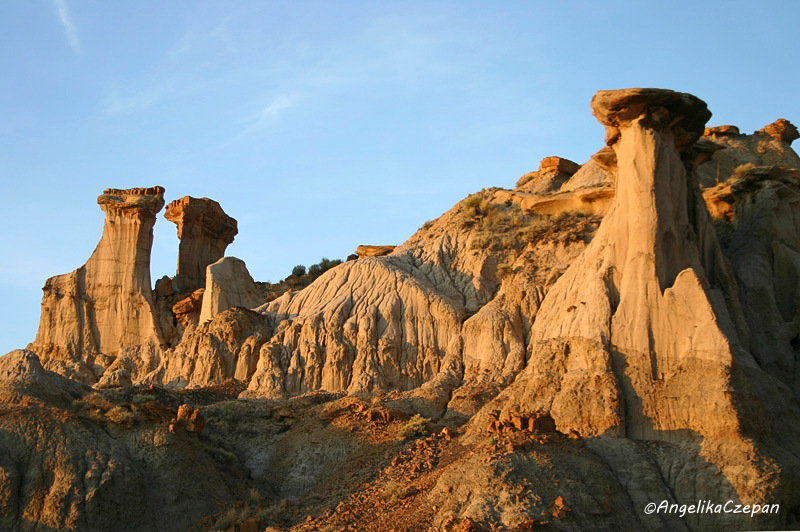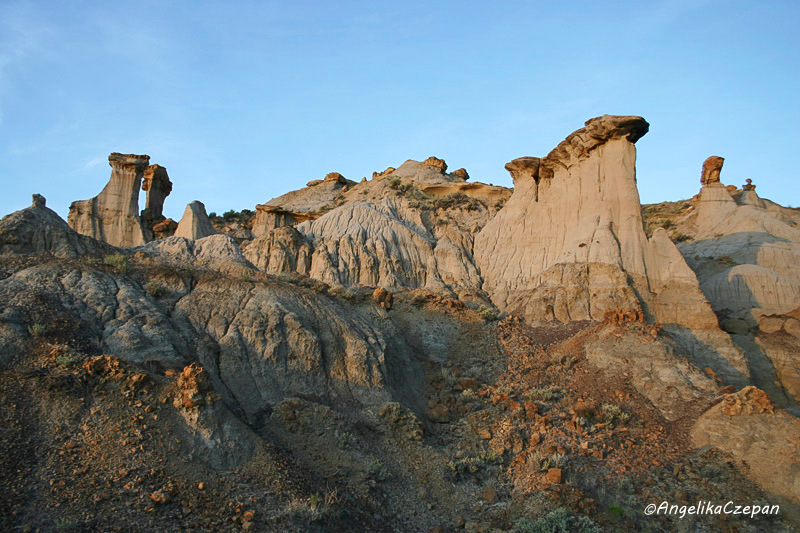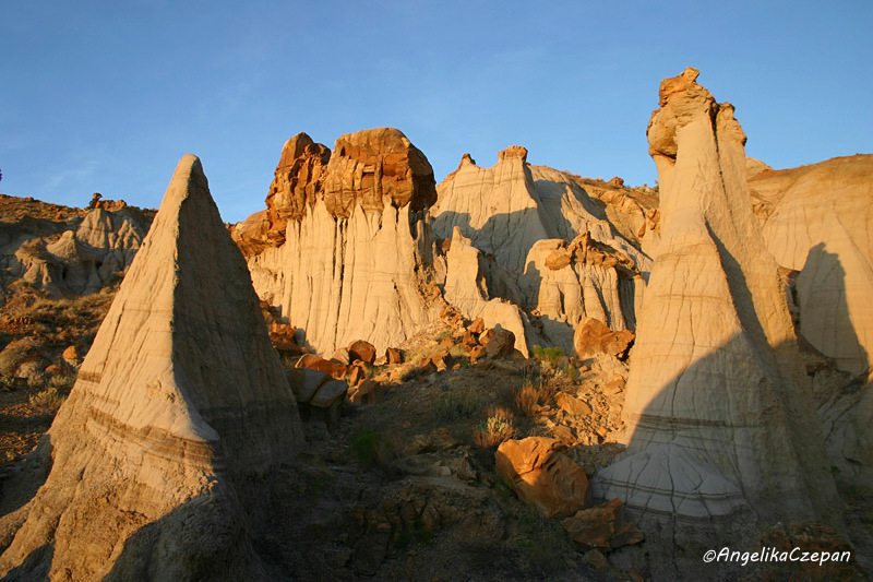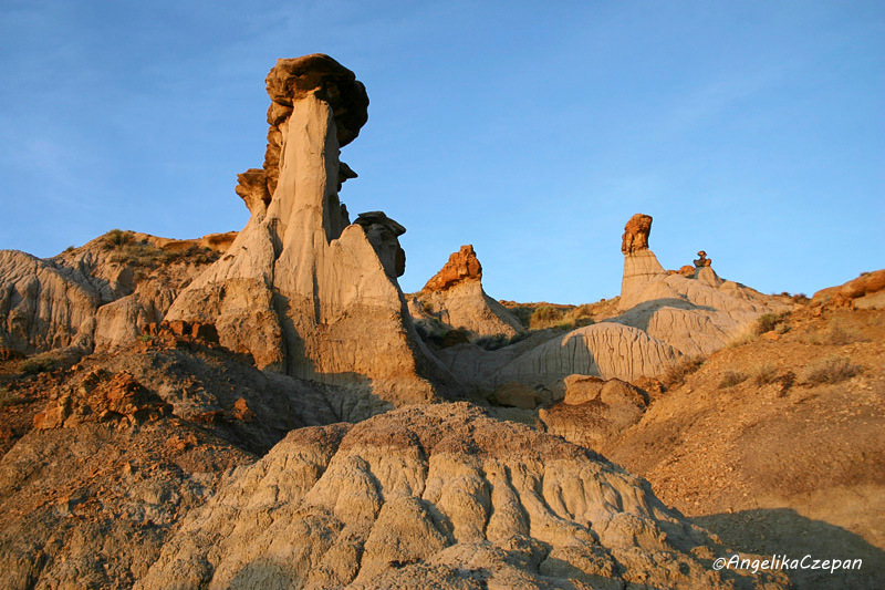 Von hier aus führt ein schmaler Fußweg ein Stück weit in ein großes Amphitheater hinab und dann nach links in ein Gebiet mit zahlreichen interessanten Felspyramiden und Hoodoos, das besonders kurz vor und nach Sonnenaufgang sehr viele schöne Fotomotive bietet (RIO07). Wer will, kann von hier aus noch weiter in die Badlands hinuntersteigen und das Gebiet auf eigene Faust weiter erkunden.