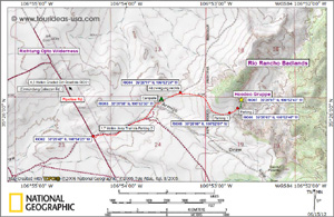 Man biegt hier nach links auf die Pipeline Road ab und gelangt dann bald zu einem ersten großen Gatter, das zur Zia Indian Reservation gehört, und das man für die Weiterfahrt öffnen und wieder schließen muss. Nachdem man die Zia Indian Reservation bei einem 2. Gatter wieder verlassen hat, erblickt man nach 4,3 Meilen auf der Pipeline Road einen schmalen Feldweg, der nach links abzweigt (RIO02). Von nun an folgt man einfach immer diesem Feldweg, der zunächst eine Meile Richtung Ost-Nordost führt und dann einen großen Bogen nach rechts macht, bis man nach insgesamt 1¾ Meilen zu einer weiteren Abzweigung gelangt (RIO05). Hier kann man bereits das Fahrzeug abstellen und zu Fuß weitergehen oder man fährt noch 150 Meter weiter nach links bis zu einer größeren Parkfläche direkt oberhalb des Rim (RIO06).