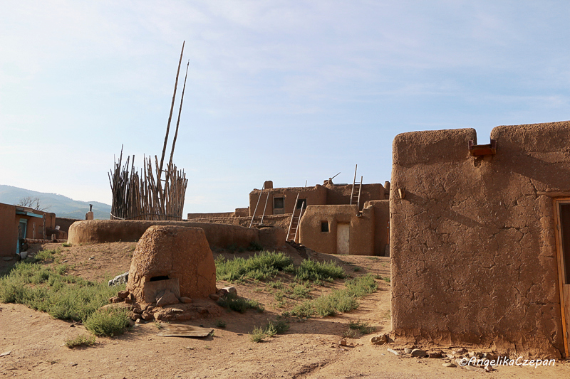 Taos Pueblo wurde zwischen 1.000 und 1.450 n. Chr. erbaut und gehört damit neben Ácoma zu den beiden ältesten, ständig bewohnten Siedlungen des amerikanischen Südwesten. Der Rio Pueblo de Taos teilt das Dorf in zwei Hälften - Hlauuma (Nordhaus) und Hlaukwima (Südhaus). Beide stammen aus der gleichen Zeit. Erbaut wurde das Pueblo aus Adobe, einem Gemisch aus Erde, Wasser und Stroh, das in Ziegelformen gegossen und an der Sonne getrocknet wird. Die bis zu fünfstöckigen Gebäude besitzen ein Dach aus Baumstämmen und Zweigen, abgedeckt mit Lehm. Die Außenwände werden ständig instandgehalten, indem neue Schichten feuchter Erde als Putz aufgetragen werden. Früher besaßen die Räume weder Fenster noch Türen. Der Zugang erfolgte über Leitern durch Öffnungen in der Decke. Heute sind zwar Eingangstüren und Fenster eingebaut, aber zwischen den einzelnen Räumen gibt es immer noch keine Verbindungstüren. Typisch für Taos sind die zahlreichen bienenkorbförmigen Backöfen aus Adobe, auch 'hornos' genannt. Bis heute gibt es im Pueblo weder fließend Wasser noch Elektrizität.