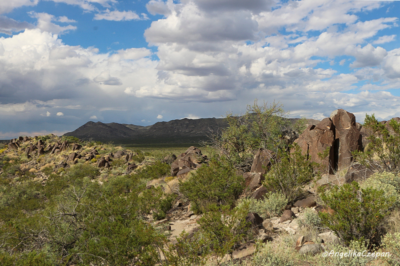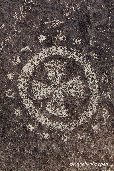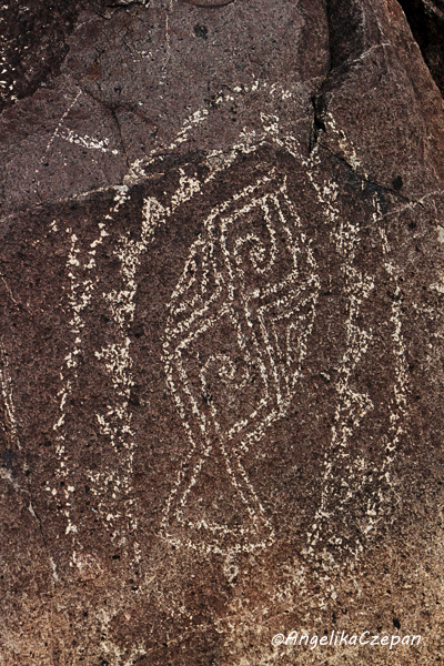 Vom unteren Ende des Parkplatzes führt ein angenehm zu gehender Weg geradeaus und dann rechts zunächst leicht bergauf und dann über mehrere hintereinander liegende Hügel, die übersät sind mit schwarzen Felsblöcken und Petroglyphen. Um möglichst viele davon zu sehen, geht man dabei auf dem Hinweg auf der rechten Seite der Hügel vorbei, auf dem Rückweg auf der linken. Besonders wichtige Fundstellen sind mit nummerierten Stopps versehen, wer aber ein bisschen aufmerksam schaut und sucht, wird daneben unzählige viele andere schöne Symbole und Felszeichnungen entdecken, darunter richtige kleine Kunstwerke. Die interessantesten Petroglyphen sind dabei im hinteren Teil des Wegs zu finden.
