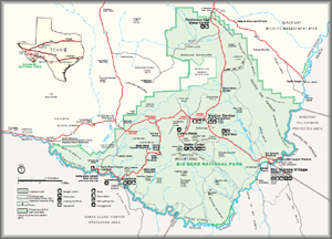Der Park besitzt zwei Eingänge. Den Westeingang erreicht man von Alpine über die SR 118 oder von Presidio bzw. Lajitas über den Hwy 170 (s. El Camino del Río). Zum Nordeingang gelangt man von Alpine und Marathon aus über die US 385. Visitor Center: das Hauptgebäude befindet sich bei Panther Junction. Auskünfte und Broschüren erhält man auch bei den Rangerstationen Castolon, Chisos Basin und Río Grande Village.
