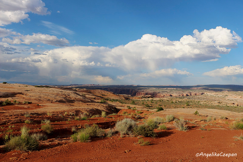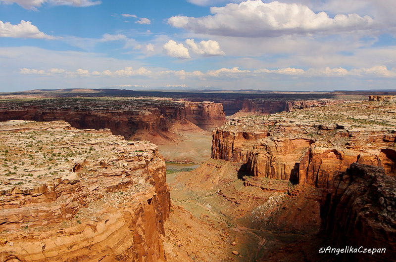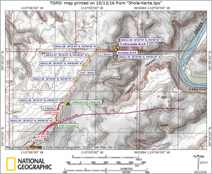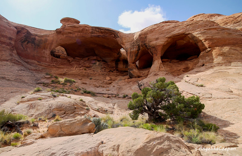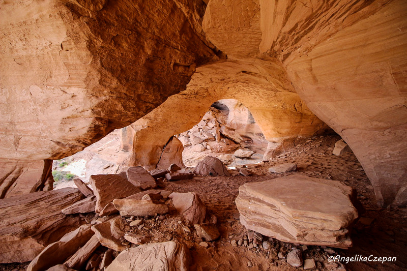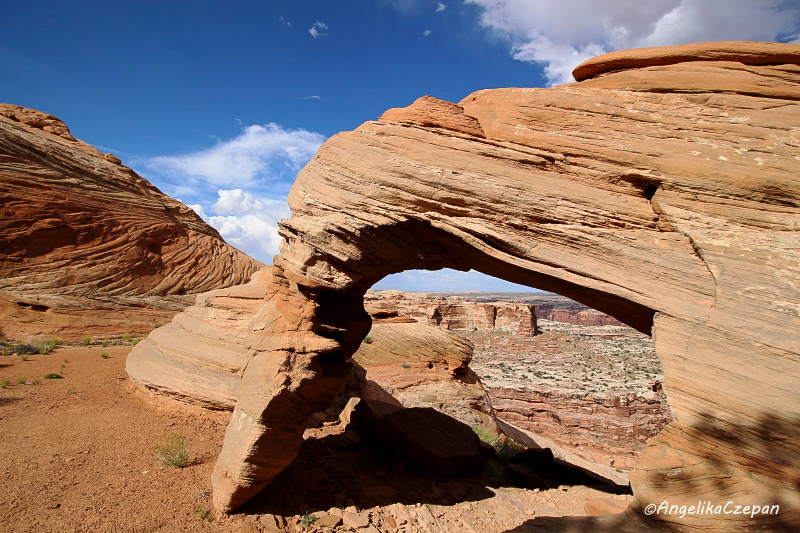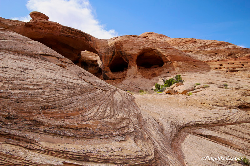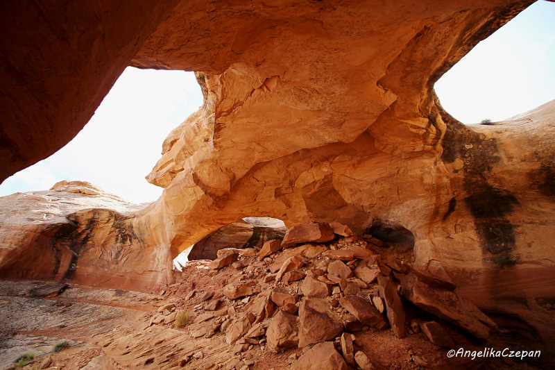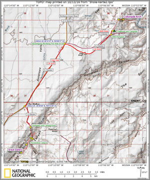 Da der Weg hinunter auch nicht ganz einfach zu finden ist, orientiert man sich auch hierbei wieder am besten an den Steinmännchen. Dabei geht es etwas südlich des Steinbogens über zum Teil sehr abschüssige Slickrockfelsen nach unten und von dort im Bogen wieder ein Stück links hinauf zum Arch. Von dort bietet sich auch ein einzigartiger Blick hinunter in den Two Mile Canyon, der eine Meile östlich von hier in den Labyrinth Canyon mündet. Auf dem Rückweg kann man noch dem kleinen Access Arch einen Besuch abstatten. Dafür geht man vom Five Hole Arch zurück um die Felskante herum und von dort wieder ein Stück nach oben (5HOLE-10).