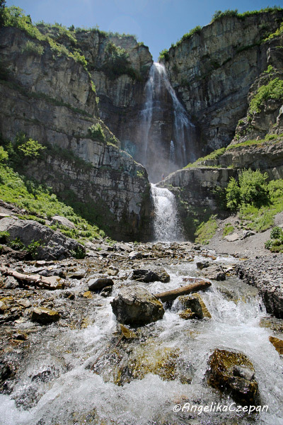 Fährt man vom Visitor Center der Timpanogos Caves weiter Richtung Osten, gelangt man nach 8,2 Meilen zum Summit Trailhead und kurz dahinter zur Abzweigung der FR 114. Hier biegt man links ab und folgt dann dem Sträßchen 7 Meilen bis zu den Cascade Springs. Diese Gebirgsquelle produziert täglich 28 Millionen Liter Wasser, unabhängig von Niederschlagsmenge oder Jahreszeit. Ursache hierfür ist ein riesiges, unterirdisches Wasserreservoir in einer Kalkhöhle am Berghang oberhalb der Quelle, das sich durch Schmelzwasser und Regenfälle immer wieder neu auffüllt. Unterhalb der Quelle, die mit ihrem Teppich aus Wasserkresse an eine riesige, überflutetet Wiese erinnert, bildet der im Wasser gelöste Kalk kleine Sinterterrassen und Becken, in denen sich zahlreiche Forellen tummeln. Vom Parkplatz führt ein sehr schön angelegter Rundweg mit Holzplanken und Brücken durch dieses kleine Naturparadies, das mit seinen kleinwüchsigen Birken, Ahornbäumen, Weiden und Wildblumen ein einzigartiges Ökosystem bildet. Für die Rundwanderung benötigt man circa eine halbe Stunde.