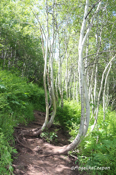 Der Weg zu den Stewart Cascades beginnt auf der linken Seite des Parkplatzes (während rechts gleich hinter dem Eingang der Mt. Timpanogos Trail beginnt). Von hier wandert man zunächst in leichter Steigung bergauf und dann dem Berghang weiter folgend nach links. Anschließend geht es über Stock und Stein auf schmalem Wurzelweg immer leicht bergauf und bergab durch Haine voller Farne und hübsch gebogener Aspentrees, bis man schließlich eine freie Fläche erreicht, von der sich die ersten schönen Blicke auf die umgebende Berglandschaft bieten.
