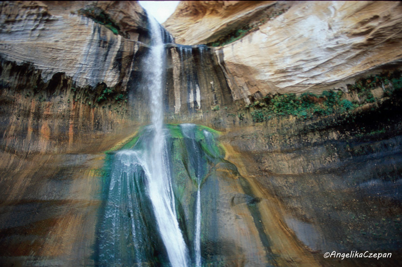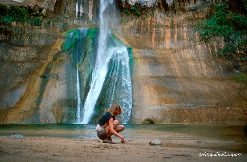 Die überaus lohnende und landschaftlich sehr abwechslungsreiche Wanderung führt durch den malerischen Calf Creek Canyon zu den Lower Calf Creek Falls, die am Ende des Tals aus 38 Metern Höhe in die Tiefe stürzen. Am Fuß der Wasserfälle befindet sich ein flacher, runder Pool, eingerahmt von feinem Sand und einer dichten, feuchtigkeitsspeichernden Ufervegetation aus Gräsern, Wildblumen, Laubbäumen und Schilf. Bestes Fotografierlicht bietet sich hier vom späten Vormittag bis zum frühen Nachmittag. Der Weg folgt zunächst dem breiten, baumbestandenen Tal in leichtem Auf und Ab über die Felsen am linken Canyonrand, später dem sich zunehmend verengenden Canyon auf schmalem, sandigem Pfad immer am Bach entlang . Das Gehen in dem tiefen, feinen Sand kann besonders in der Mittagshitze sehr anstrengend sein. Deswegen lieber etwas mehr Zeit einplanen und und möglichst früh am Morgen aufbrechen. Dies gilt umso mehr, da der Trail sehr beliebt ist und man später am Tag kaum mehr einen Parkplatz bekommt.