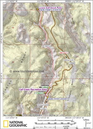Die Recreation Area westlich von Escalante liegt malerisch von hohen Canyonwänden eingerahmt am Ufer des ganzjährig wasserführenden Calf Creek. Besonders einladend ist das durch einen kleinen Damm aufgestaute Wasserbecken, in dem man während der Mittagshitze oder nach dem Wandern ein erfrischendes Bad nehmen kann. Zwischen Campground und Picknick Area befindet sich der Ausgangspunkt für die landschaftlich sehr abwechslungsreiche Wanderung zu den Lower Calf Creek Falls, die am Ende des Tals aus 38 Metern Höhe kaskadengleich über glatt geschliffene, bunt gefärbte Felswände in die Tiefe stürzen.