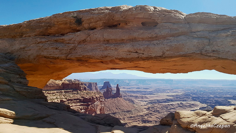 6 Meilen hinter dem Visitor Center gelangt man zum Parkplatz am Mesa Arch, einem fotogenen Steinbogen mit Blick auf den weit entfernten Washer Woman Arch und die Bergkette der La Sal Mountains. Hier versammeln sich vor Sonnenaufgang stets unzählige Fotografen, um das Erglühen des Steinbogens in Bildern festzuhalten. Man erreicht den Steinbogen über einen kurzen Trail, der zunächst etwas bergauf auf eine Kuppe und dann wieder bergab führt.