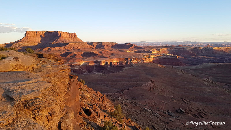 12 Meilen weiter zweigt nach rechts eine Nebenstrasse ab zum Horsethief Campground, einem sehr schön gelegenen und günstigen BLM Campingplatz in unmittelbarer Nähe zu den Canyonlands. Gleich dahinter kommt ebenfalls rechts die Abzweigung zur Mineral Bottom Road, einer ungeteerten Piste, über die man hinunter zum White Rim gelangt. 15 Meilen ab Hwy 191 führt ein erster möglicher Abstecher von 8 Meilen one-way dann nach Osten Richtung Dead Horse Point State Park. Dies ist allerdings ein vom Nationalpark getrennter Park, für den auch extra Eintritt zu bezahlen ist. Dies lohnt sich hauptsächlich, wenn man vorhat, dort zu campen. Vom Dead Horse Point Overlook am Ende der Strasse bietet sich zudem ein toller Blick auf die 600 Meter tiefer liegenden Fluss-Schleifen des Colorado River.