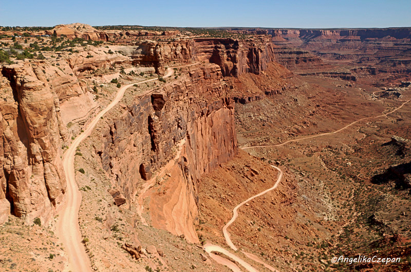 Fährt man der Hauptstraße folgend weiter nach Süden, erreicht man die Entrance Station des Nationalparks und dahinter links abzweigend den Beginn der ungeteerten Shafer Trail Road, die in steilen Zickzack-Kurven hinunterführt zum White Rim. Einen schönen Blick auf diese ungewöhnliche Serpentinenstrecke bietet sich ein Stück weiter beim Shafer Trail Overlook. Es folgt das Visitor Center von Island in the Sky, in dem man aktuelle Informationen über den Zustand der Geländestrecken sowie die hierfür erforderlichen Day-Use Permits erhält.