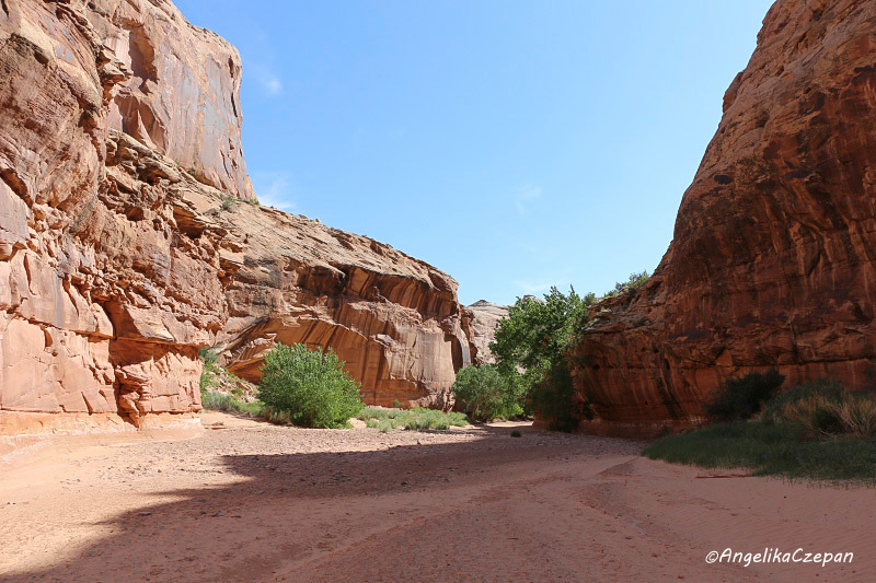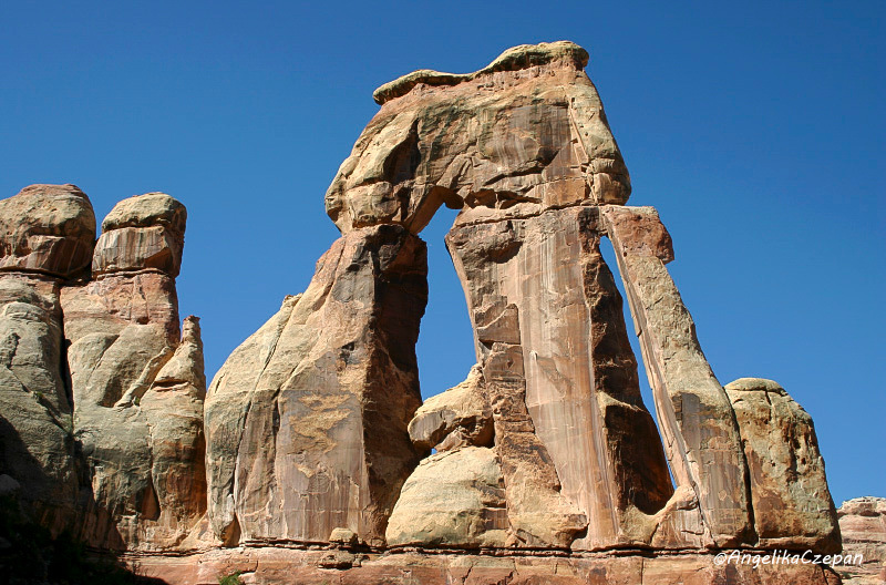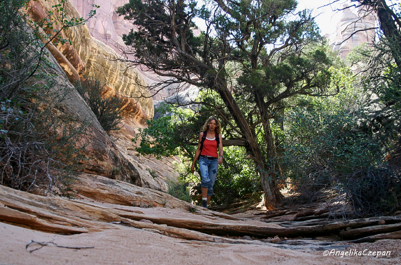 Für den weiteren Weg zum Druid Arch folgt man nun weiter stets den Steinmännchen im teils sandigen, teils felsigen Bachbett des Elephant Canyon. An einigen Stellen führt der Weg jedoch aus dem Bachbett hinaus und verläuft dann etwas oberhalb am Felshang. Da man diese Ausstiege leicht verfehlen kann, sind diese in der Regel durch zwei nebeneinander liegende Steintürmchen markiert. Wichtig ist dies insbesondere gegen Ende der Wanderung, denn wer hier den Aufstieg aus dem immer schmaler werdenden Canyon verpasst, landet nicht oben beim Druid Arch, sondern zuerst in immer dichter werdendem Gestrüpp und dann an einem tiefen Wasserloch, bei dem es kein Weiterkommen mehr gibt. Wer sich bis hierher verlaufen hat, sollte dann einfach wieder umkehren und nach den Steinmännchen suchen, die die Stelle markieren, an der der Pfad den Canyonboden verlässt und steil an der linken Canyonwand bergauf klettert. Anstrengend ist dann nochmals die letzte steile Kraxelpartie mit fast 100 Meter Höhenunterschied hinauf zu einer Felsplattform gegenüber dem malerisch vor einem tiefblauen Himmel sich abzeichnenden Steinbogen.