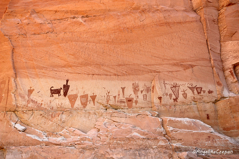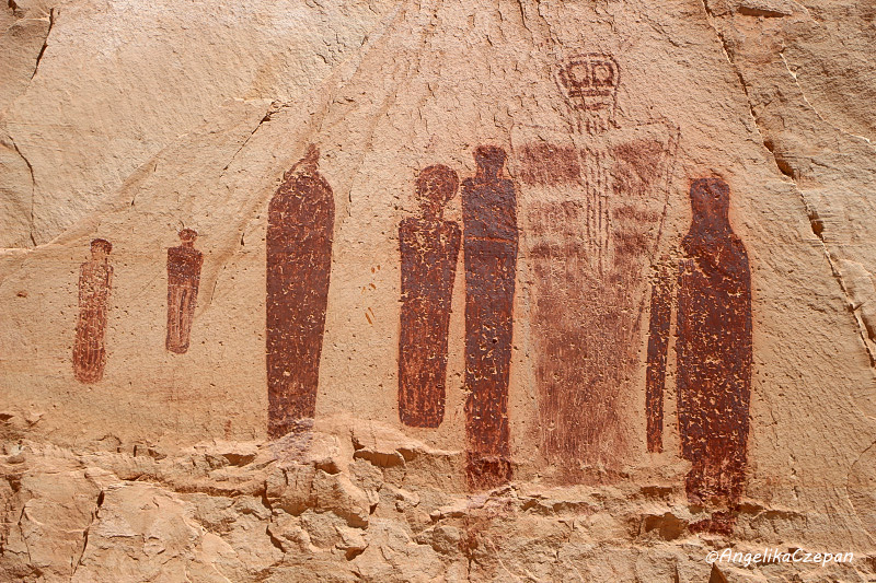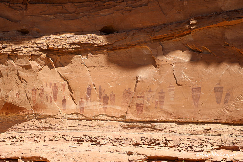 Von hier sind es 0,5 Meilen bis zur Alcove Gallery, die sich auf der rechten Canyonseite unter einem großen Felsüberhang befindet (HORSE-04) und danach nochmals eine Meile bis zur Great Gallery, dem größten und wohl eindrucksvollsten Rock Art Panel der Barrier Kultur im Südwesten der USA. Dieses Felspanel, das sich unterhalb eines Felsüberhangs über eine Länge von 64 Metern erstreckt, besteht aus einer Aneinanderreihung menschlicher Figuren im typischen Barrier Style, also ohne Arme und Beine, die Körper mit rot-weißen Mustern reich verziert. Links davon in einer Felsnische ist eine weitere Personengruppe dargestellt, unter denen eine durch ihre Größe und Dekoration besonders heraussticht. Diese auch Holy Ghost Panel genannte Felszeichnung besitzt ein geschätztes Alter von 3.000 bis 3.500 Jahren.