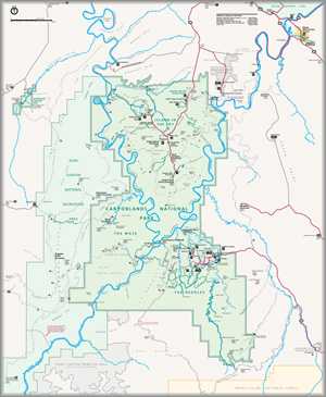Utahs größter Nationalpark umfasst eine grandiose Canyonlandschaft, die im Laufe von Jahrmillionen durch die Erosionskraft des Green und Colorado River aus einem riesigen Sandsteinplateau gemeißelt wurde. Die beiden Flüsse teilen auch das Parkgebiet in vier große voneinander getrennte Regionen, zwischen denen keine Verbindungsstraßen existieren. Am leichtesten erreichbar ist das Gebiet von Island in the Sky nördlich von Moab, das von einem langen geteerten Scenic Drive sowie einer 120 Meilen langen Jeeproad, dem White Rim Trail, erschlossen wird. Hier befindet sich auch der Upheavel Dome, ein gewaltiger blaugrün gefärbter Krater, von dem man nicht genau weiß, ob er von einem Meteoriteneinschlag stammt oder vulkanischen Ursprungs ist. Etwas weiter südlich liegt das Gebiet der Needles mit seinen charakteristischen Felsnadeln. Hier beginnt auch eine der schönsten Wanderungen in den Canyonlands, der Chesler Park Loop Trail. Weit abgelegen und nur mit Geländewagen erreichbar sind die beiden großen Wildnisgebiete The Maze und Horseshoe Canyon im Westen des Parks.