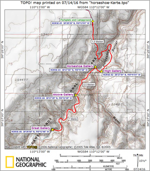 Innerhalb des Canyons führen nun schmale, mit Steinmännchen markierte Seitentrails zu den einzelnen Rock Art Sites. Das erste dieser Panels, die High Gallery, befindet sich 1,6 Meilen ab Trailhead auf der linken Canyonseite einige Meter oberhalb des Canyonbodens an einer breiten Felswand (HORSE-02). Schräg gegenüber befindet sich auf der rechten Seite ein weiteres Felspanel, die Horseshoe Gallery (HORSE-03).