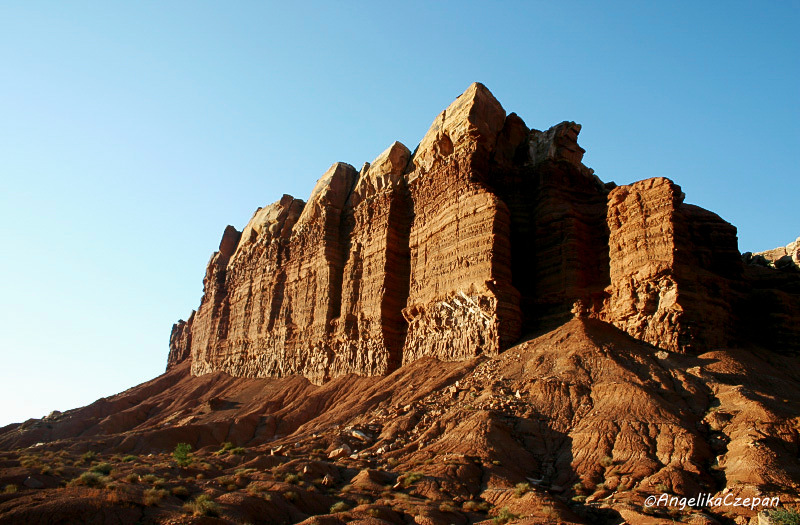 Der anstrengende Weg führt aus der dunklen Schlucht der Capitol Gorge am Rande mehrerer Canyons entlang bergauf bis zu einem ausgesetzten Felsplateau mit tollem Blick auf die Bergkuppe des Golden Throne auf der einen Seite und das tief eingeschnittene Tal auf der anderen Seite. Bestes Fotolicht hat man hier am späten Nachmittag.