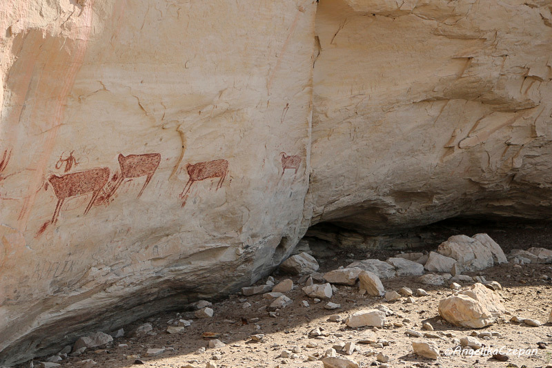 Das hübsche Felspanel, das nicht zum Capitol Reef Nationalpark gehört, ist vom Hwy 12 aus mit einem Geländewagen leicht zu erreichen. Dafür biegt man in Teasdale, einem winzigen Nest 4,7 Meilen südlich des Hwy 24, vom Hwy 12 nach Westen ab auf die ungeteerte Teasdale Road und von dieser nach weiteren 0,9 Meilen auf die Fish Creek Road. Diese schmale, steinige Piste ist mit vielen tiefen Schlaglöchern und tiefen Querrillen übersät. Daher sollte man hier sehr langsam und vorsichtig fahren. 1,7 Meilen weiter erreicht man eine Art Parkplatz, an dem man sein Auto abstellen kann. Von hier aus sind es nur ein paar Schritte zu Fuß bis zu der großen, weißen Felswand auf der rechten Seite, an deren unterem Ende sich das Fish Creek Panel befindet. Diese Felsmalerei wird der Barrier Kultur zugeordnet und besitzt damit ein geschätztes Alter von 1500 bis 40000 Jahren.