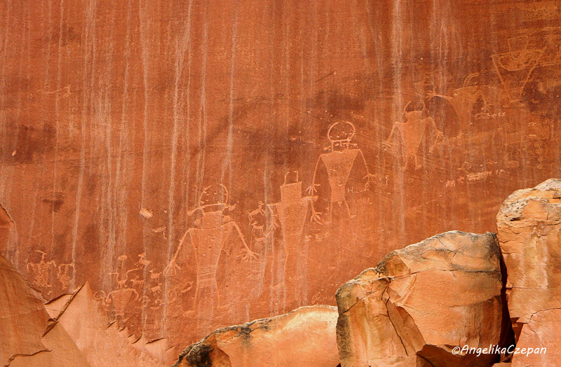Fährt man vom Visitor Center auf dem Hwy 24 weiter gen Osten, erreicht man als nächstes auf der linken Straßenseite den Parkplatz für den kurzen Petroglyph Trail. Dieser führt als Holzbohlenweg an einer großen Felswand entlang zu mehreren Rock Art Panels der Fremont Kultur.