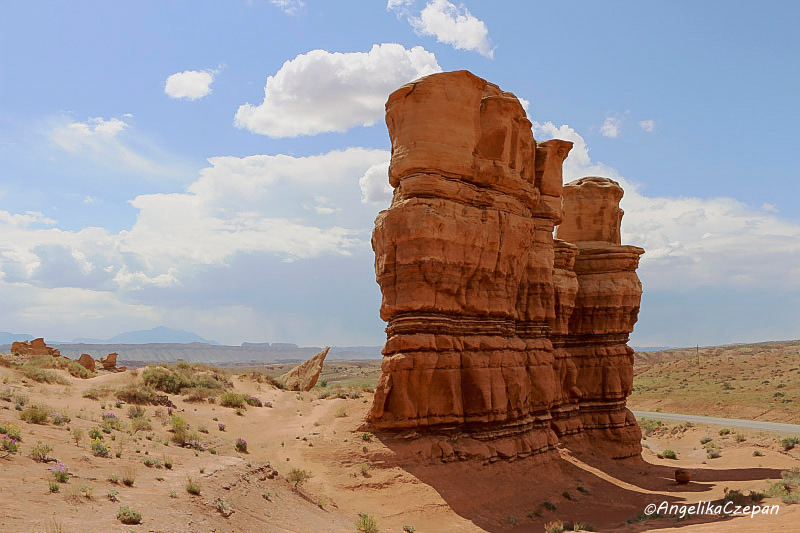Zwei dicke Hoodoos aus rotem Sandstein auf der linken Straßenseite.
