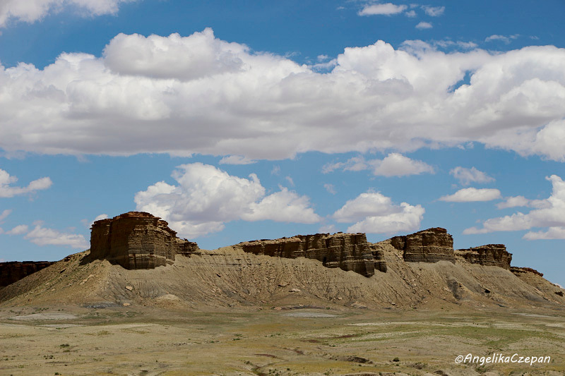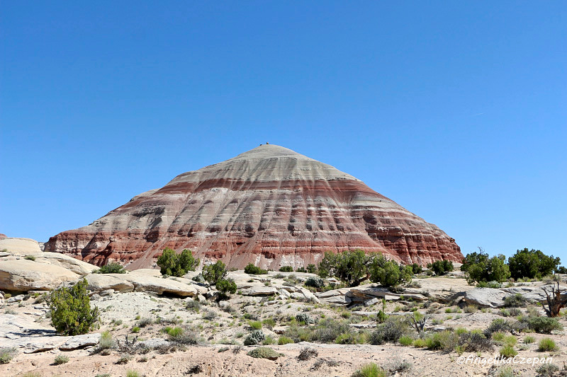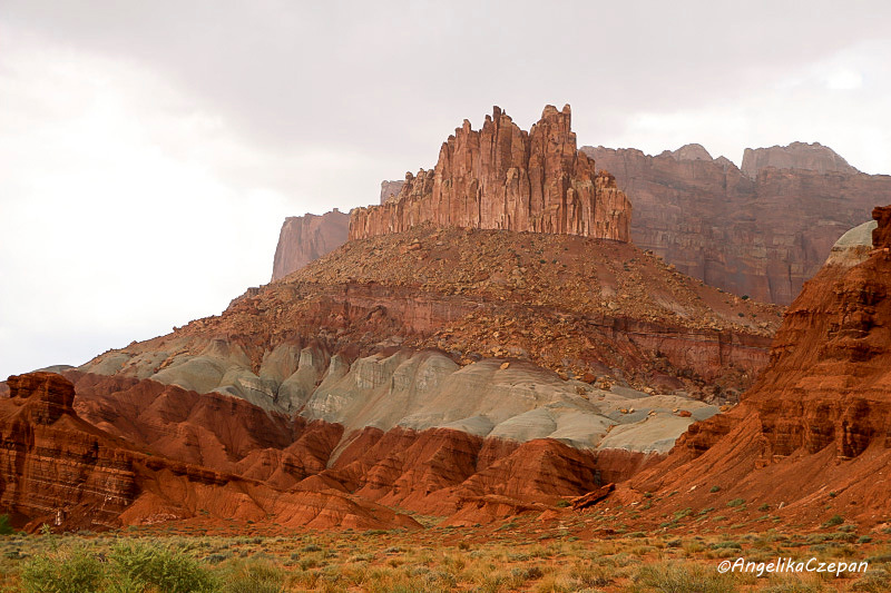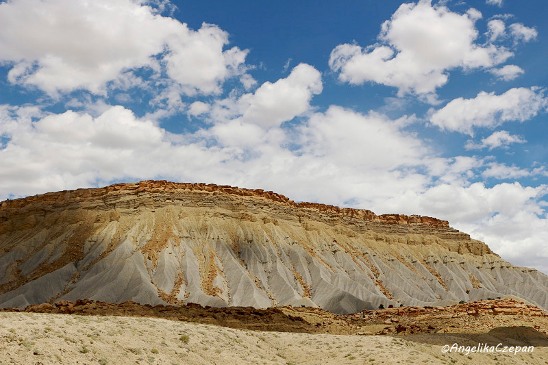 Fährt man dagegen auf der Hauptstrecke (nun ebenfalls Burr Trail Road genannt) weiter geradeaus Richtung Süden und Lake Powell, wird die Landschaft wieder offener, die Straße breiter, immer noch begleitet von den farbig gezackten Felsbändern der Waterpocket Fold, die hier am Nachmittag besonders schöne Fotomotive bietet. Später wechselt die Szenerie und wird dominiert von mächtigen, dunklen Felsblöcken, die wie mittelalterliche Burgfestungen auf grauen Steinhügeln thronen und so die flache, weit gestreckte Wüstenlandschaft überragen.