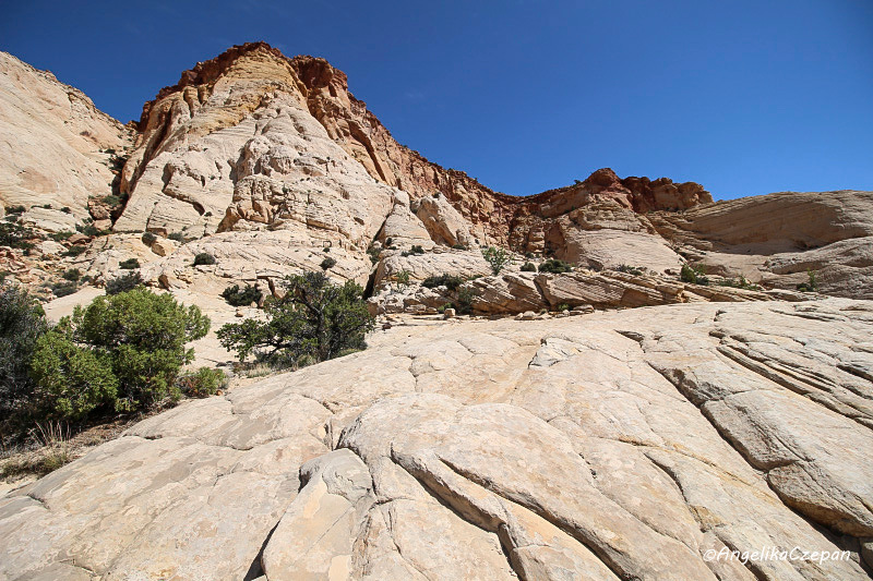 Nächster markanter Punkt ist der Capitol Dome, ein mächtiger kuppelförmiger Felsendom aus hellem Sandstein, in dessen Nähe gleich mehrere schöne Wanderwege beginnen, darunter der Hickman Bridge Trail, der Rim Overlook Trail und auf der Straßenseite gegenüber der Cohab Canyon Trail. Ein Stück weiter östlich befindet sich auf der rechten Straßenseite ein kleiner Pullout. Dies ist der Trailhead für die schöne Wanderung durch den Grand Wash.