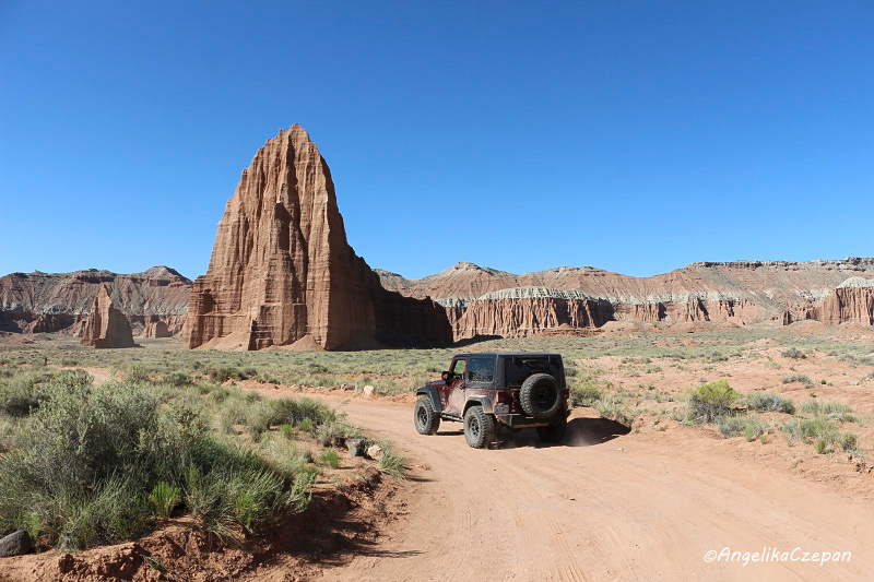 Für eine Fahrt durch das abgelegene und nur von wenigen besuchte Cathedral Valley im Nordosten des Parks benötigt man einen Geländewagen mit guter Bodenfreiheit, Allrad und möglichst kurzem Radabstand, denn die knapp 60 Meilen lange Dirt Road, die das Gebiet erschließt, ist teilweise sehr ruppig und nicht gerade einfach zu fahren. Zudem muss man gleich zu Beginn den Fremont River überqueren, eine 30 Meter lange Furt. Daneben gibt es einige sandige und felsige Abschnitte, aber auch viele tiefe Schlaglöcher und ‚washes', d.h. schmale, von Sturzbächen ausgewaschene Rinnen, die quer zur Fahrbahn verlaufen. Hier besteht bei ungenügender Bodenfreiheit die Gefahr, hinten aufzusitzen. Wer nicht mit einem Geländewagen unterwegs ist, kann sich vor Ort einen Jeep mieten oder an einer geführten Jeeptour teilnehmen (s. Aktivitäten). Bei Nässe sollte man von einer Fahrt durch dieses Gebiet übrigens absehen, denn die an vielen Stellen lehmhaltige Piste wird dann extrem glatt und rutschig. Im Visitor Center erhält man gegen eine kleine Gebühr die Broschüre 'Self Guiding Auto Tour'.