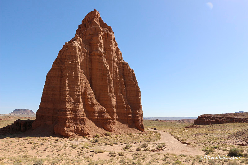 Dahinter führt die Straße in steilen Kurven bergauf und dann wieder bergab durch eine von weißen Felsen und Wacholdersträuchern dominierte Canyonlandschaft, bevor sie schließlich in eine langgezogene rötliche Sandpiste übergeht, die geradeaus ins Lower Cathedral Valley führt. 15 Meilen ab Beginn der Tour zweigt man hier einem Holzschild folgend nach links ab zu den Felstempeln und zum Glass Mountain. Kurz danach markiert ein Schild des NPS den Beginn des Nationalparkgebiets. Rechts daneben befindet sich ein kleiner Campingspot. Etwas weiter weist ein Holzschild den Weg nach rechts zum Glass Mountain, einem interessanten kleinen Hügel aus Selenit (Gips-) Kristallen. Nach diesem kurzen Abstecher folgt man nun der schmalen und sandigen Piste weiter geradeaus bis zum gewaltigen Temple of the Sun und dem etwas kleineren Temple of the Moon.