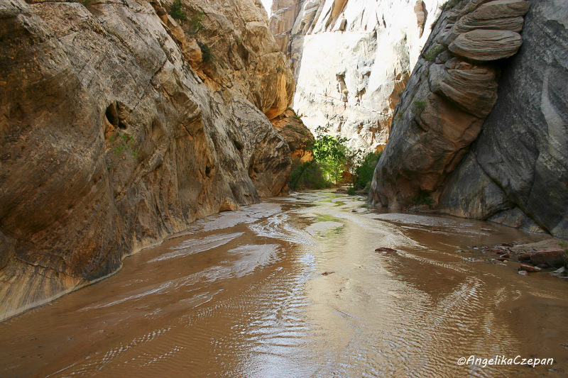 Vom Parkplatz aus erkennt man nach Westen blickend schon die breite Öffnung des Hackberry Canyon. Jetzt muss man nur den parallel zur Straße verlaufenden Cottonwood Creek überqueren und schon geht es mal rechts, mal links am Bachbett des Hackberry Creek entlang, bis der Canyon schließlich so schmal wird, dass man einfach direkt im teils sandigen, teils mit kleinen Kieseln übersäten Flussbett entlangwandert. Da man dabei unweigerlich nass wird, sollte man für diese Wanderung Schuhe wählen, die ein gutes Profil haben und denen Nässe nichts ausmacht. Für gute Fotos eignet sich am besten der frühe Morgen oder der späte Nachmittag. Gegen Mittag werfen die hohen Canyonwände am Anfang des Canyons dagegen dunkle Schatten. Nach ca. 2 Meilen wird der Canyon offener und flacher. Dies ist für eine Halbtageswanderung ein guter Umkehrpunkt.