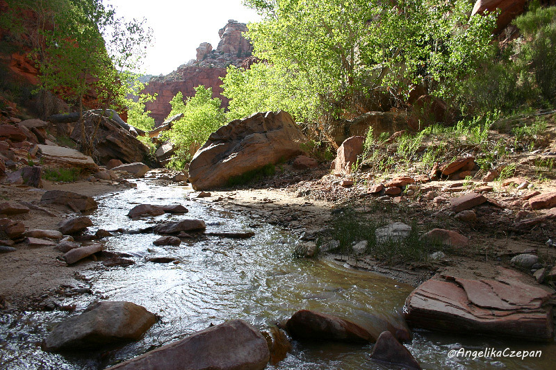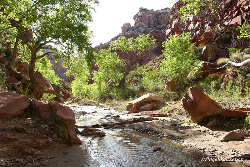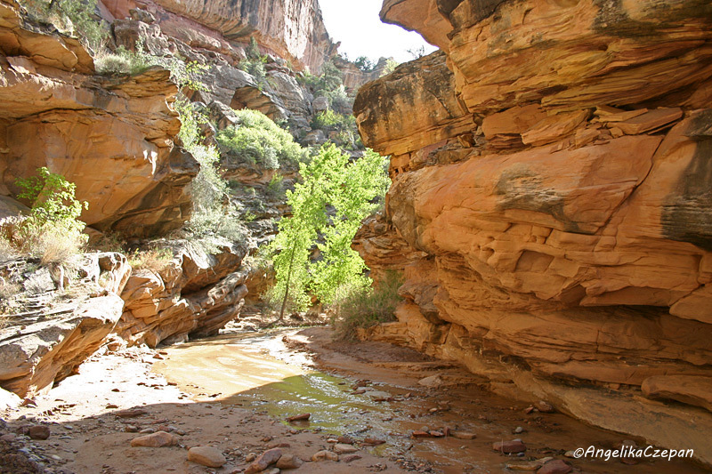 Eine Wanderung durch den unteren Teil des Hackberry Canyon ist vor allem bei großer Hitze ein herrlich erfrischendes Erlebnis, denn man wandert größtenteils direkt im (meist knöcheltiefen) Bachbett, dessen Ufer von Gräsern und großen Cottonwood Trees gesäumt ist. Diese Bäume bilden mit ihren knackig hellgrünen Blättern vor allem im Frühjahr einen schönen farblichen Kontrast zu den meist dunkelroten Felswänden dieses halbschattigen, lichtdurchfluteten Canyons.