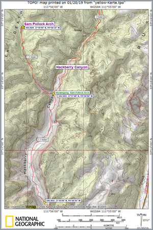 Je nach Lust, Laune und verfügbarer Zeit lässt sich diese Tour beliebig lang ausdehnen, vom 2- oder 3-stündigen Kurztrip bis zur zweitägigen Backpacking Tour. Bei einer längeren Wanderung lohnt sich auch ein Abstecher zum 20 Meter hohen und 23 Meter breiten Sam Pollock Arch, der sich etwa 6 Meilen von der Cottonwood Canyon Road entfernt in einem kleinen Seitencanyon befindet (Abzweigung Sam Pollock Arch HACK03, GPS-Daten Sam Pollock Arch HACK04). Sofern man zwei Fahrzeuge zur Verfügung hat, kann man die Tour durch den 18 Meilen langen Hackberry Canyon auch als Streckenwanderung durchführen. Das zweite Fahrzeug parkt man dann am Upper Hackberry Canyon Trailhead 7,5 Meilen südlich des Kodachrome Basin State Park an der BLM Road 422. Eine weitere schöne Ergänzung dieser Tour ist eine Wanderung vom Hackberry Canyon Trailhead hinauf zum Yellow Rock.