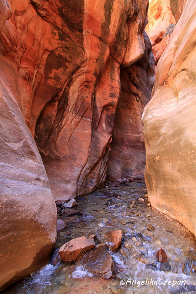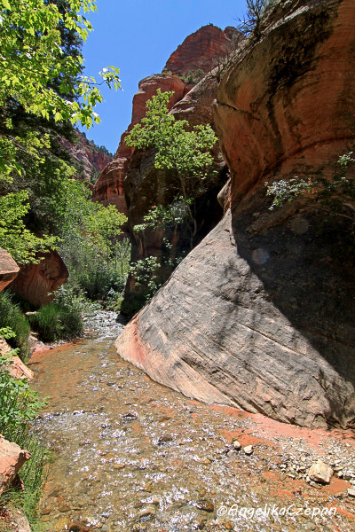 Zunächst ein Tipp: nehmen Sie sich für die Wanderung einen stabilen, langen Ast oder Wanderstöcke mit. Diese können stellenweise sehr hilfreich sein, da der schmale Fußpfad, der sich am Bachbett entlang windet, oft sehr abschüssig, sandig oder rutschig ist. Er verhindert auch, dass man bei den häufigen Bachüberquerungen und beim Waten durch die Narrows auf den glatten Steinen ausrutscht und ins Wasser fällt, was vor allem bei einer teuren Fotoausrüstung schnell die ganze Wanderfreude verderben könnte. Aus dem gleichen Grund sollte man auch auf gute Schuhe achten, mit denen man längere Zeit durchs Wasser waten kann und die ausreichend Profil besitzen, damit man beim Klettern über die oft glatten und nassen Felsblöcke genug Halt hat.