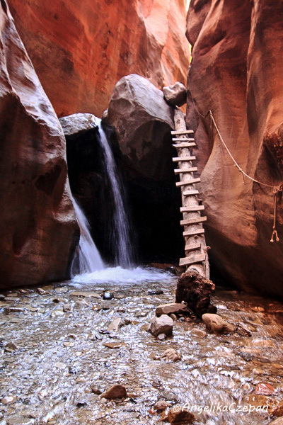 Die Wanderung selbst bietet sehr viel Abwechslung und macht dadurch auch Kindern sehr viel Spaß, vor allem das Waten durch die von hohen Felswänden eingeschlossenen Narrows. Hier bietet sich hinter jeder Wegbiegung wieder ein neuer, spannender Anblick, von Fotomotiven gar nicht zu reden. Ist man dann an der engsten Stelle des Slot Canyons angekommen, steht man unvermittelt vor einem hohen Felsabsatz, der den Weg versperrt und einem Wasserfall, der sich über diese Felskante malerisch in ein breites, flaches Wasserbecken ergießt. Um an dieser Stelle weiter zu kommen, wurde aber eine Art Aufstiegshilfe eingerichtet. Man muss dafür über einen langen, schräg angelehnten Baustamm nach oben steigen, was durch einige aufgenagelte Holzleisten und zwei an der Felswand angebrachte Seile zusätzlich erleichtert wird.