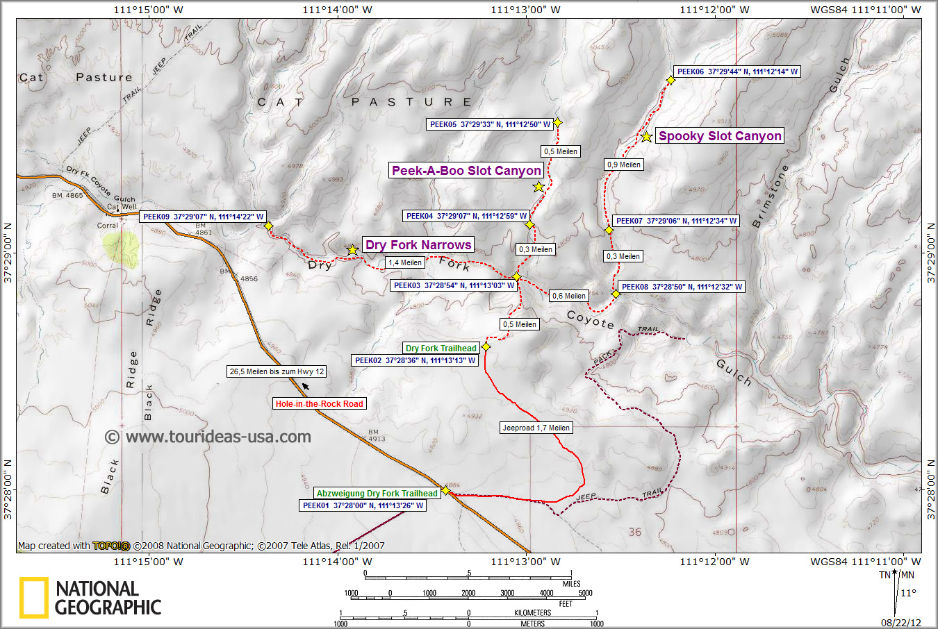 Karte Dry Fork, Peek-A-Boo und Spooky Slot Canyons