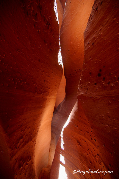 Für die einfachere Variante zwei wandert man vom Eingang des Peekaboo weiter im breiten Bachbett der Coyote Gulch abwärts, folgt dann aber nach etwa 300 Metern einem schmalen Fußpfad, der um einen Hügel herum nach links in einen Seitencanyon abzweigt. Bereits wenige hundert Meter weiter steht man schließlich vor dem Eingang des Spooky Canyon, dem ultimativen Slot des Südwestens (PEEK07). Hier zeigt sich schon nach wenigen Metern, was das Wort Spaltencanyon bedeutet. Langsam, einen Fuß vor den anderen setzend, die Hände an den Felsen, schiebt man sich seitlich verdreht durch die Felsspalten. Wo es für manche aufgrund des Körperumfangs einfach zu schmal wird, kann man auch ein wenig in die Knie gehen, denn manchmal ist der Canyon unten etwas weiter. Zum Glück gibt es zwischen diesen schmalen Spaltenabschnitten immer wieder kleine, runde Ausbuchtungen von ein bis zwei Metern Durchmesser, an denen man etwas innehalten und den Gegenverkehr passieren lassen kann.