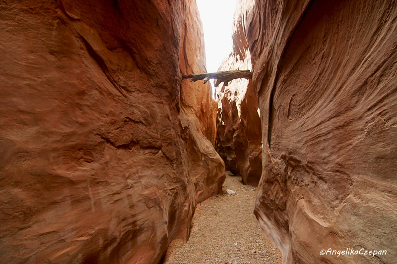 Vom Ende des Parkplatzes folgt man nun dem schmalen, gut erkennbaren Fußpfad in Serpentinen steil bergab, zunächst über Erde und Sand, später über leicht abschüssige Felsplatten, auf denen man aber mit entsprechendem Schuhwerk gut Halt findet. Unten angekommen, wandert man noch ein kurzes Stück in einem Wash, bis man schließlich das breite, ausgetrocknete Bachbett der Coyote Gulch erreicht, von dem aus die verschiedenen Seitencanyons abzweigen (PEEK03).