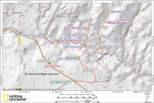 Ausgangspunkt für all diese Canyons ist der Dry Fork Trailhead. Diesen erreicht man, indem man (möglichst mit einem Geländewagen) von Escalante aus auf der ungeteerten Hole-in-the-Rock Road 26,5 Meilen nach Süden fährt und dann dem Wegweiser nach links folgend auf eine etwas schmalere Dirt Road abbiegt (PEEK01). An der nächsten Weggabel hält man sich wieder links und erreicht dann nach insgesamt 1,7 Meilen den Parkplatz, an dem man sein Fahrzeug abstellen und den Eintrag in die Register Box vornehmen kann (PEEK02). Dieser lehmhaltige und bei Nässe unpassierbare letzte Streckenabschnitt weist übrigens oft tiefe Spurrillen auf, so dass man hier mit einem PKW leicht aufsitzen und den Unterboden beschädigen kann (kein Versicherungsschutz!). Im Zweifelsfall sollte man dann lieber das Fahrzeug vorher abstellen und den restlichen Weg zu Fuß gehen. Für Wohnmobile ist diese schmale Nebenpiste definitiv nicht geeignet!