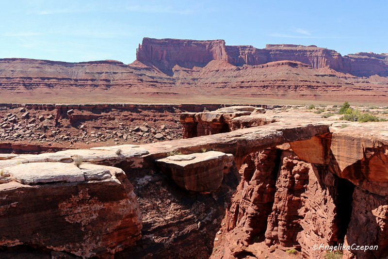 Links zweigt hier die Potash Road ab, geradeaus fahrend befindet man sich nun auf der White Rim Road, die im weiteren Verlauf immer der Abbruchkante oberhalb des Colorado folgt. 3,1 Meilen später zweigt links eine kurze Stichstraße ab zum Gooseneck Overlook, wo man einen schönen Blick auf den träge dahinfließenden Fluss genießt. Zurück auf der White Rim Road erreicht man gleich danach den Musselman Arch und damit den Umkehrpunkt für diese Tagestour. Der Musselman Arch selbst ist eine flache Steinbrücke, die sich nicht besonders vom Hintergrund abhebt und dadurch nicht ganz leicht zu fotografieren ist. Eindrucksvoll ist sie dennoch.