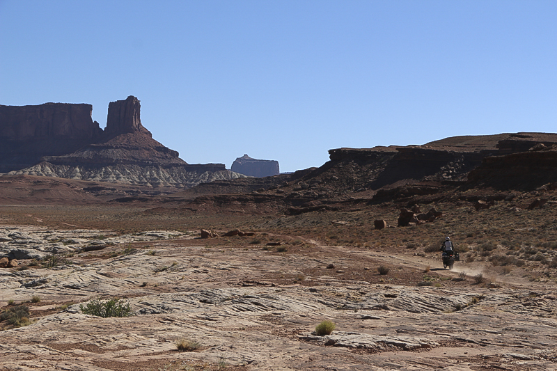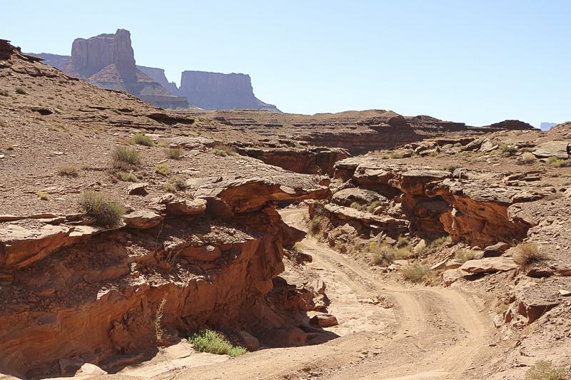 Hinter dem Plateau von Murphy Hogback geht es über ausgewaschene und steinige Switchbacks wieder bergab auf die Höhe des White Rim. Es folgt eine landschaftlich sehr schöne Strecke mit tief eingegrabenen Schluchten auf der linken Seite und eindrucksvollem Fernblick geradeaus auf den markanten und fotogenen Candlestick Tower.