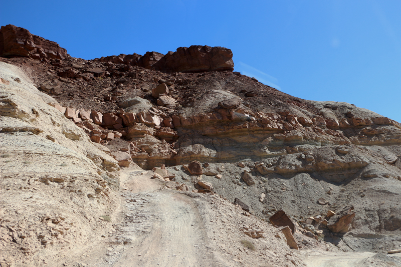 Unten am White Rim angekommen, geht es nun relativ eben weiter. Dabei folgt die zunächst noch gut befahrbare Piste stets der breiten Felskante des White Rim, von der das Gelände nochmals 300 Meter steil abfällt hinunter zu den Schluchten des Colorado. Landschaftlich ist dieser erste Teil der Strecke leider etwas eintönig. Etwas Abwechslung bieten lediglich der kurze Abstecher zum Musselman Arch und etwas später dann der Blick auf die weit entfernten Felsformationen des Airport Tower und des Washer Woman Arch.